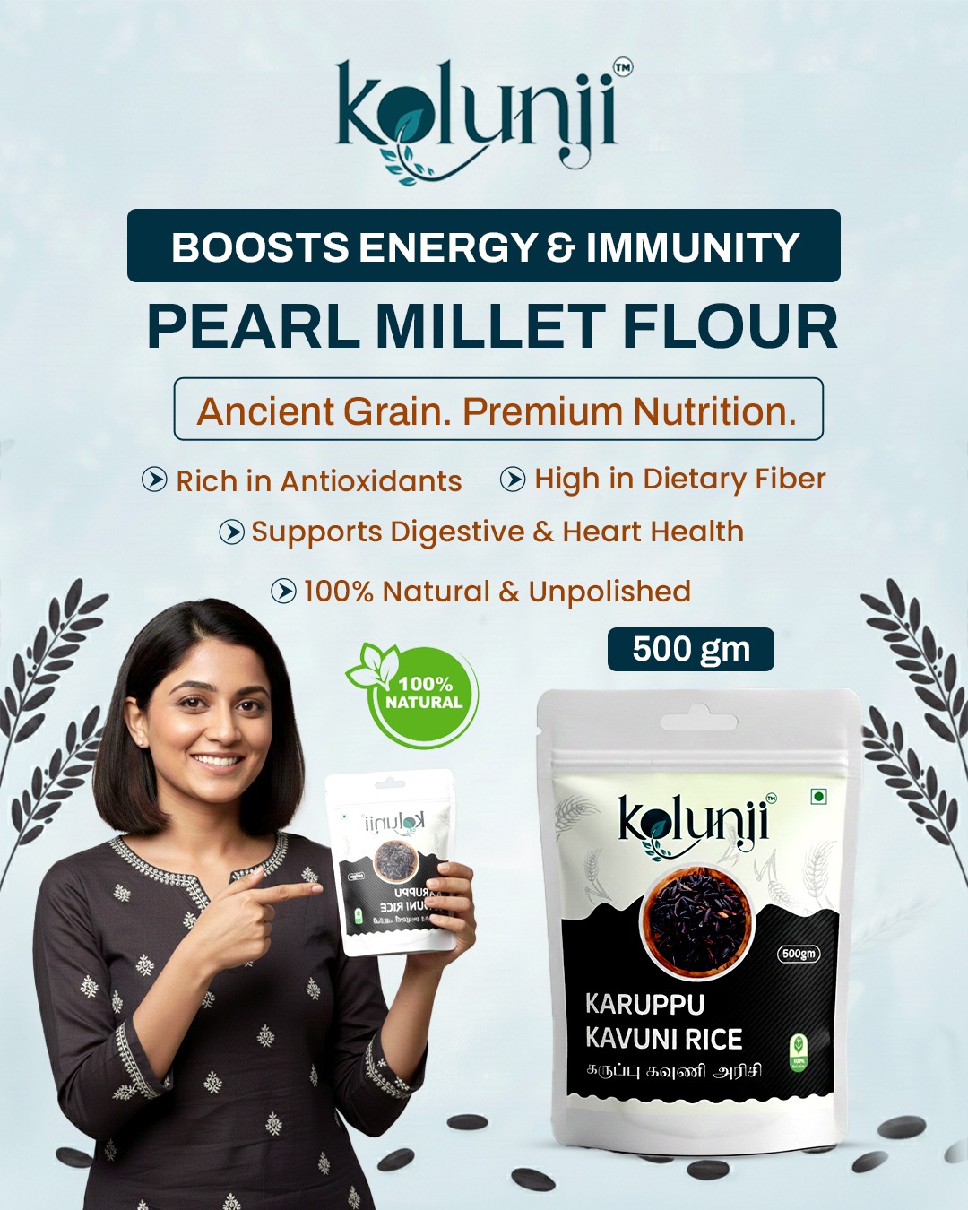 Kolunji Karuppu Kavuni Rice is a traditional black rice variety known for its rich aroma, unique taste, and high nutritional value. Carefully sourced and hygienically packed, this premium 500gm pack retains its natural color, texture, and nutrients. Karuppu Kavuni rice has been used in South Indian cuisine for centuries and is considered a wholesome and healthy alternative to regular white rice.
