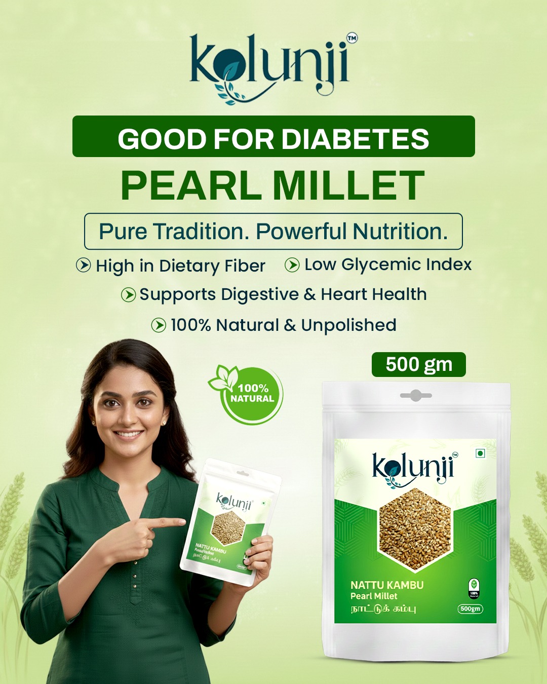 Kolunji Nattu Kambu (Pearl Millet) is a traditional, naturally grown millet known for its rich taste and high nutritional value. Carefully cleaned and hygienically packed, this 500gm pack retains its natural freshness and wholesome goodness. Nattu Kambu has been a staple in South Indian diets for generations and is widely used for preparing healthy and energy-rich meals.