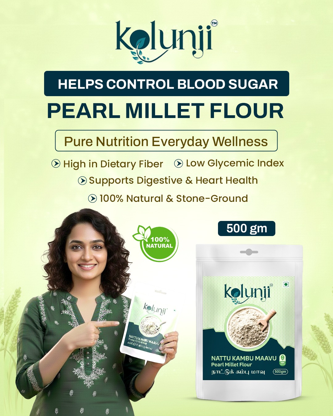 "> Kolunji Nattu Kambu Maavu (Pearl Millet Flour) is made from carefully selected traditional pearl millet grains that are cleaned and finely milled to preserve their natural nutrients and authentic taste. This 500gm pack offers a wholesome and healthy alternative to refined flours, making it perfect for preparing traditional South Indian recipes and everyday nutritious meals.">