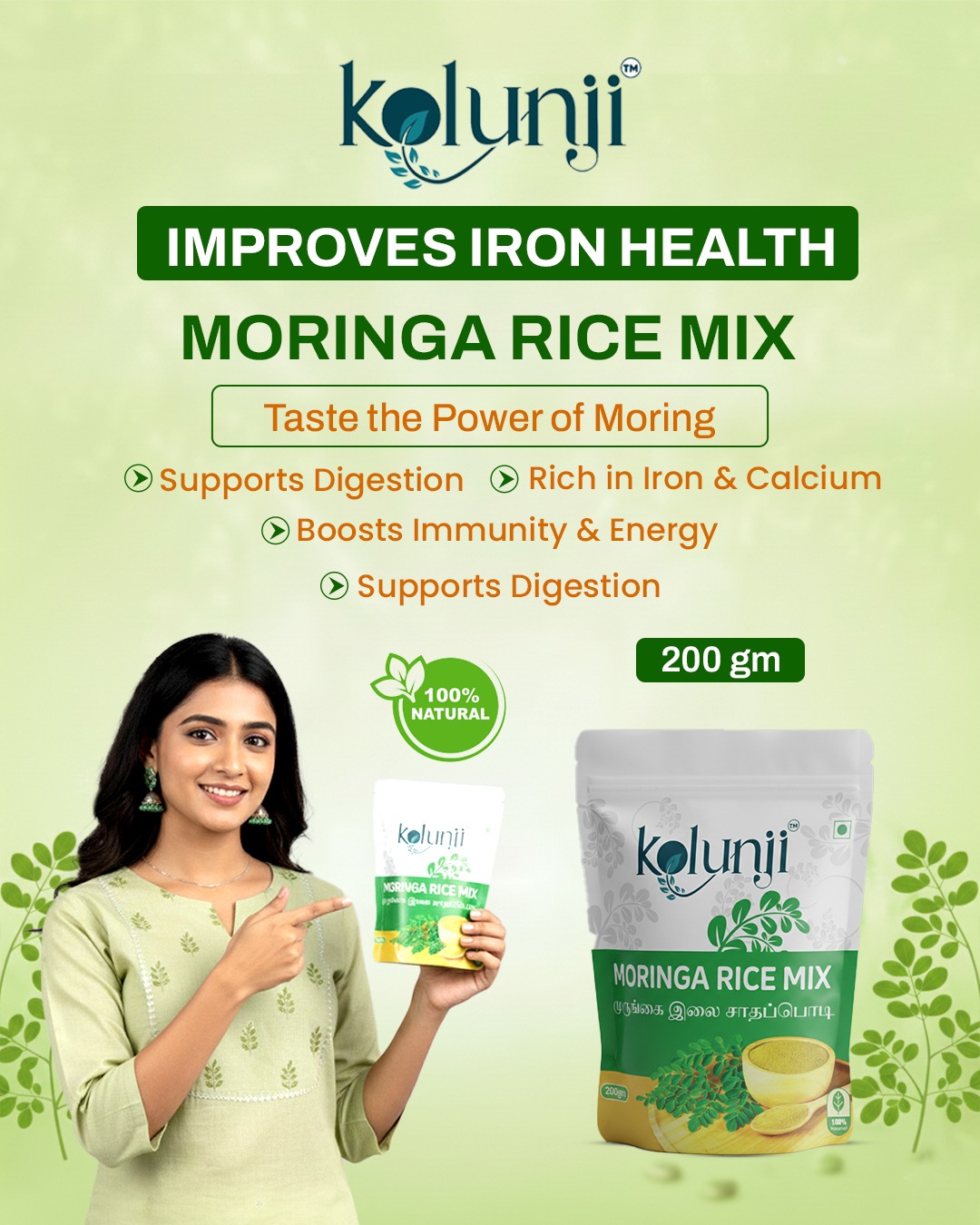 Kolunji Moringa Rice Mix is a flavorful and nutritious blend made with premium quality moringa (drumstick) leaves and traditional spices. Carefully prepared and hygienically packed, this 200gm mix allows you to prepare healthy and tasty moringa rice instantly. It combines authentic South Indian taste with the natural goodness of moringa, making it perfect for quick and wholesome meals.