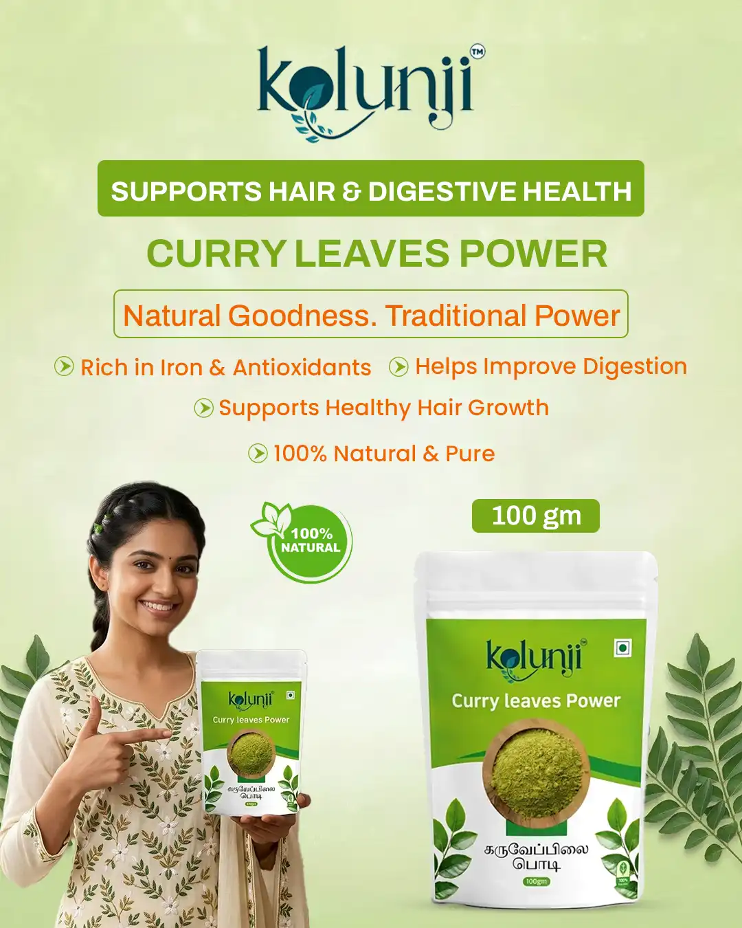 Kolunji Curry Leaves Powder is made from carefully selected fresh curry leaves that are naturally dried and finely ground to preserve their aroma, flavor, and nutrients. This 100gm pack delivers authentic taste and natural goodness, making it a perfect addition to daily meals. It enhances the flavor of traditional dishes while providing the benefits of pure curry leaves in convenient powdered form.