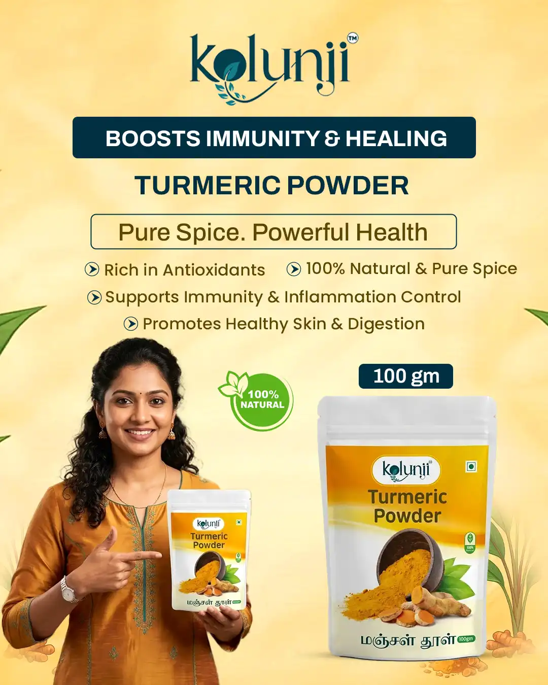 Kolunji Turmeric Powder is made from carefully selected high-quality turmeric roots that are cleaned, dried, and finely ground to preserve their natural color, aroma, and purity. This 100gm pack delivers rich golden color and authentic flavor, making it an essential spice in every kitchen. Free from artificial additives, it adds both taste and natural goodness to daily cooking.